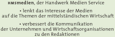 | HMSmedien, der Handwerk Medien Service, lenkt das Interesse der Medien auf die Themen der mittelständischen Wirtschaft und verbessert die Kommunikation der Unternehmen und Wirtschaftsorganisationen zu den Redaktionen.